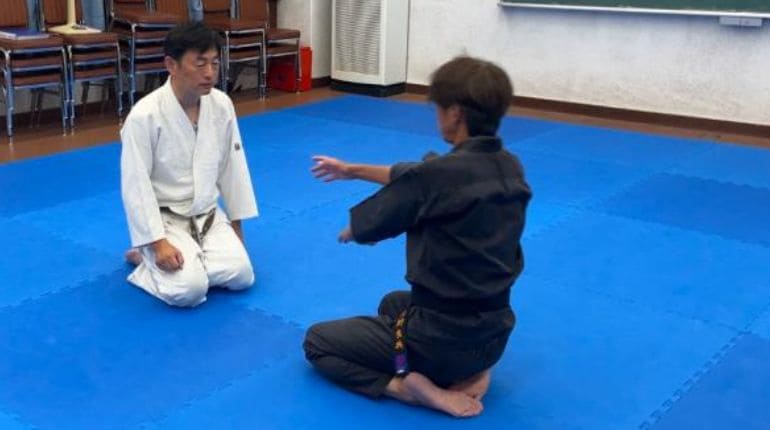 自分が正座、相手が立った状態での攻防を学びます。